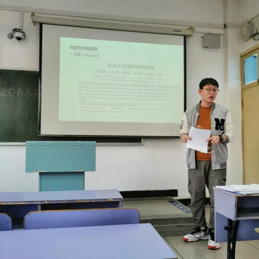 在文献检索之前,有必要对文献的类型以及其中包含的信息进行了解。王翔宇同学以生动形象的描述,为同学们介绍了本科生常用的论述型、综述型文献以及二者之间最直观的区别,随后以论述型论文为主要切入点,全面剖析了其基本结构。为了使同学们能更好的理解和掌握论述型论文的结构要点,王翔宇同学采用简单诙谐的语言进行阐述。讲解到重要部分,他还通过提问的方式对内容反复强调,加深了同学们的印象。