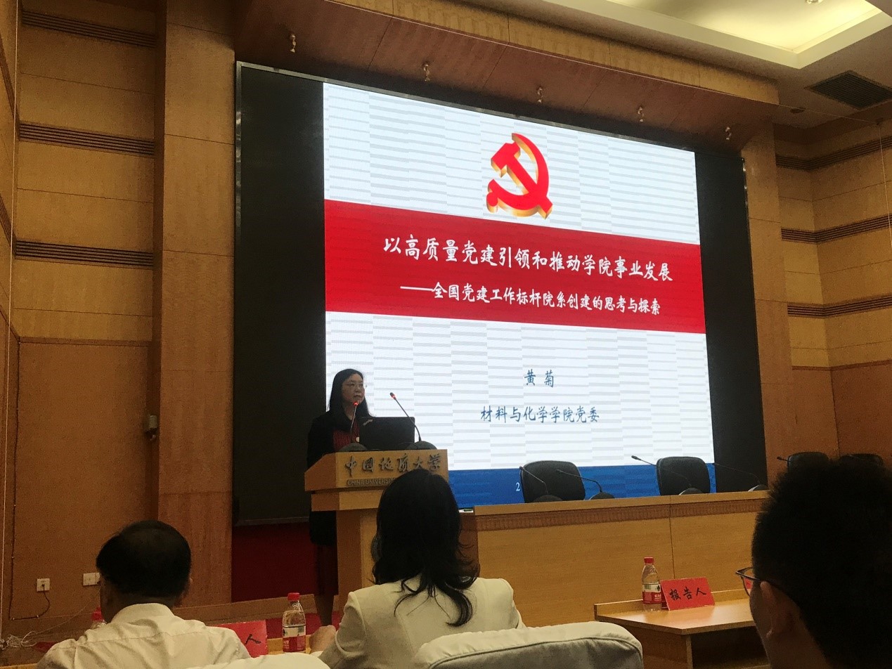 会上,全国党建工作“标杆院系”培育创建单位负责人材料与化学公司党委书记黄菊以“以高质量党建引领和推动公司事业发展——全国党建工作标杆院系创建的思考与探索”为题做了交流报告。