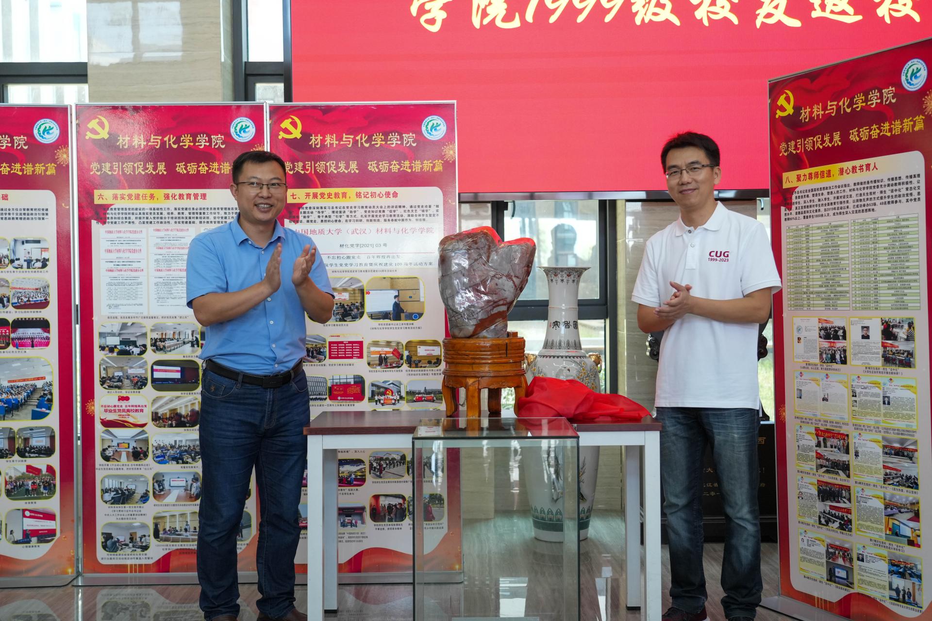座谈会结束之后,师生一行参观了未来城校区校园,并在材化楼合影留念,公司党委书记梁本哲和员工代表龚卫华为员工捐赠的纪念品“点赞石”进行揭幕。