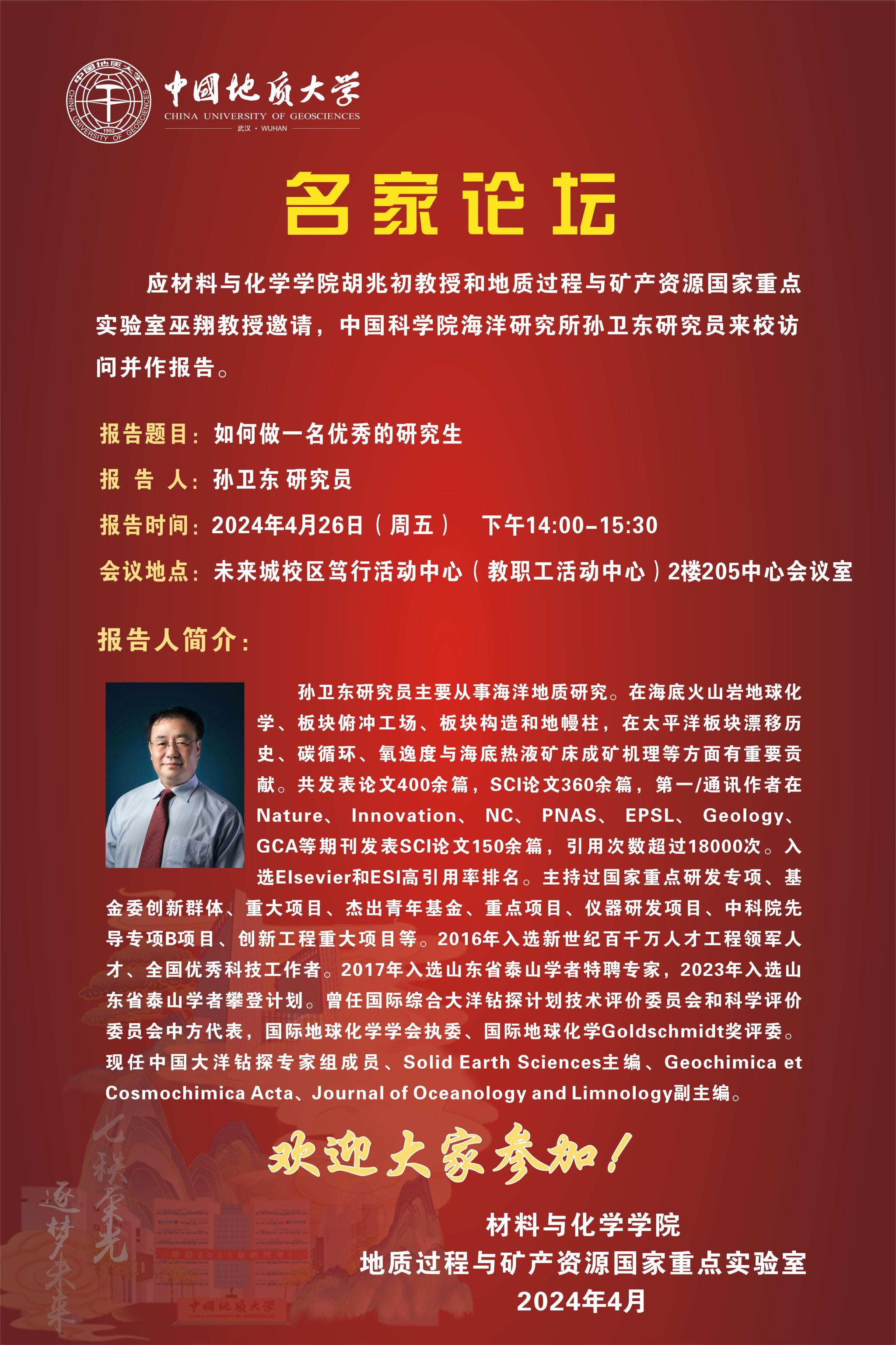 应来利国际旗舰厅及地质过程与矿产资源国家重点实验室邀请,国家自然科学二等奖、安徽省科学技术一等奖获得者,中科院海洋研究所孙卫东研究员将与公司师生交流并讲座。