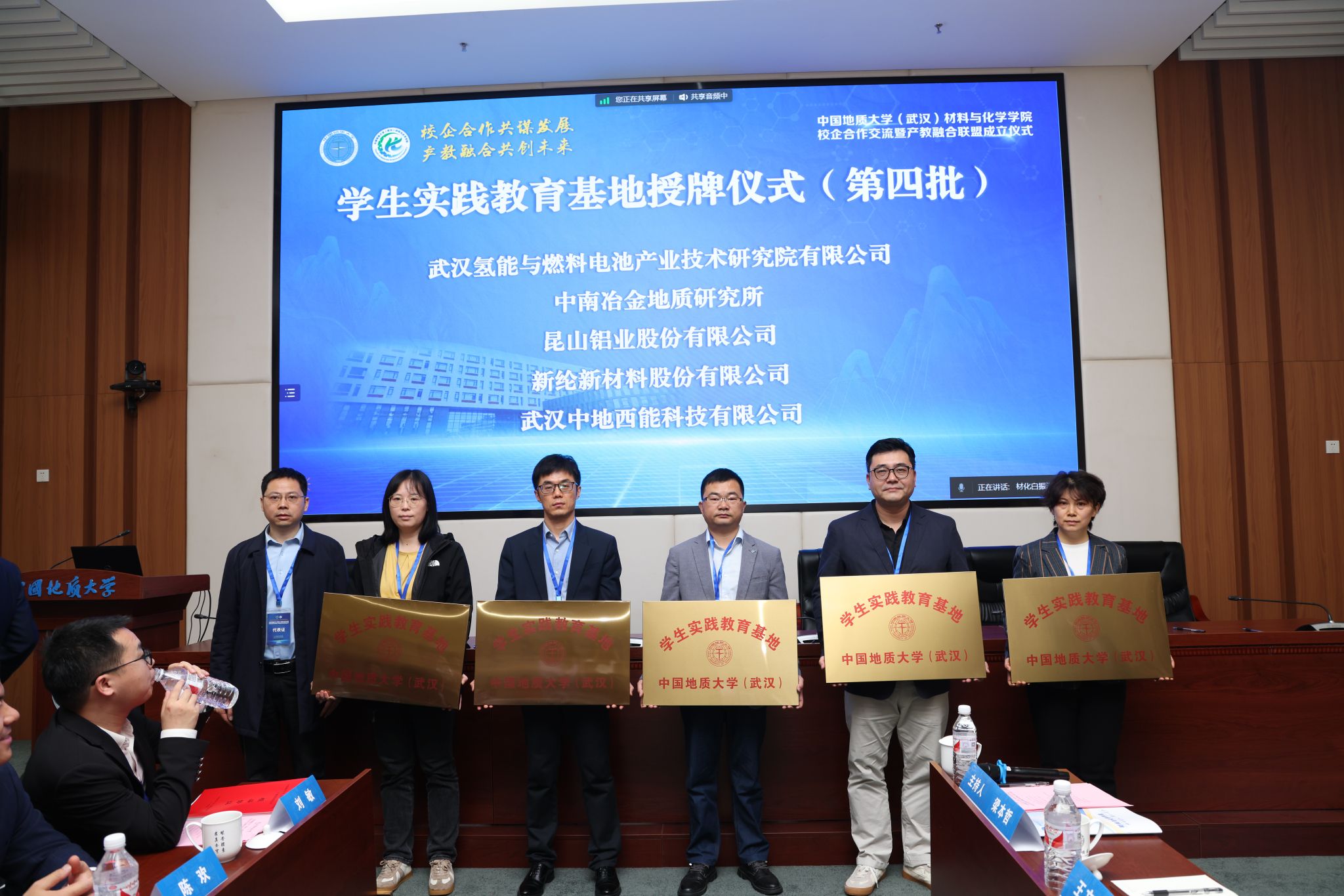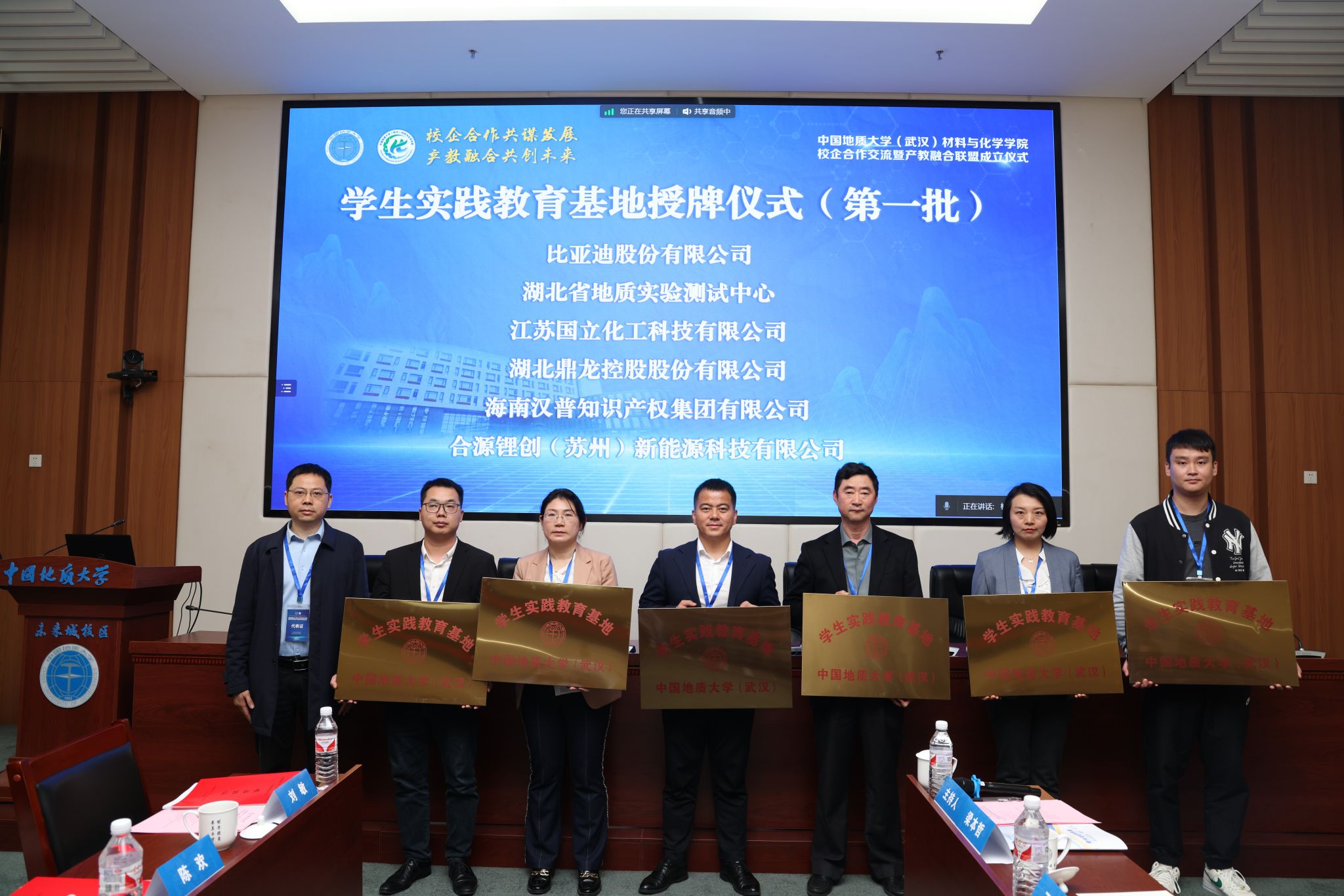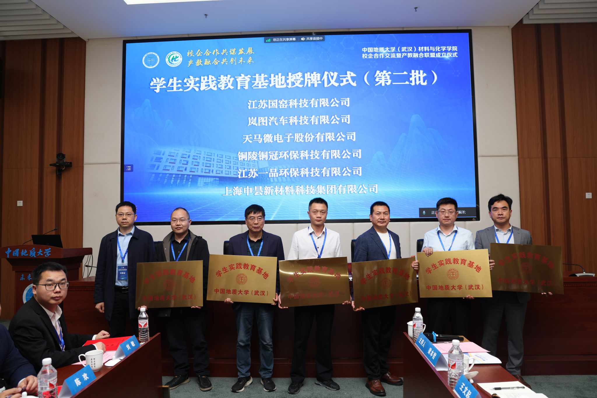 材化公司党委书记梁本哲与10家企业代表签署党建联建共创协议。胡兆初与19家企业代表签署校企合作协议,并为23家企业授员工实践教育基地铜牌。