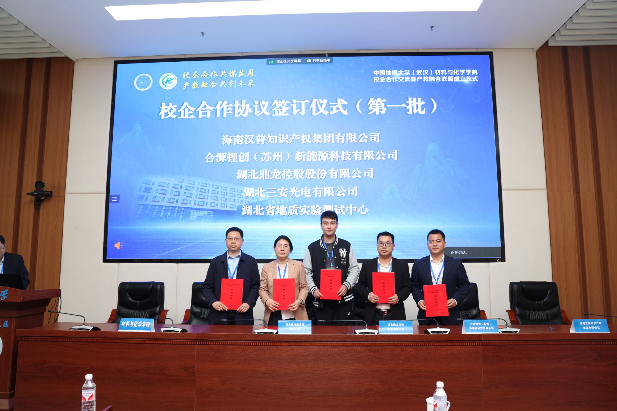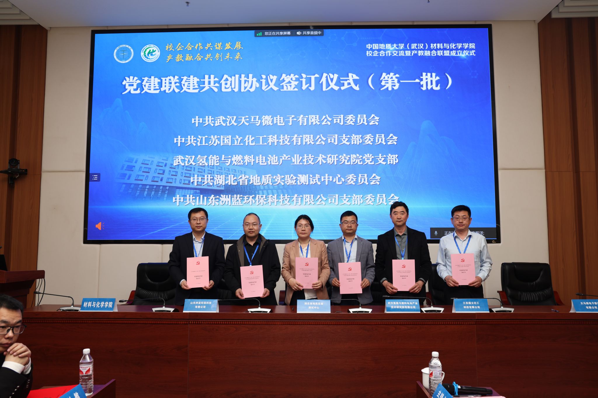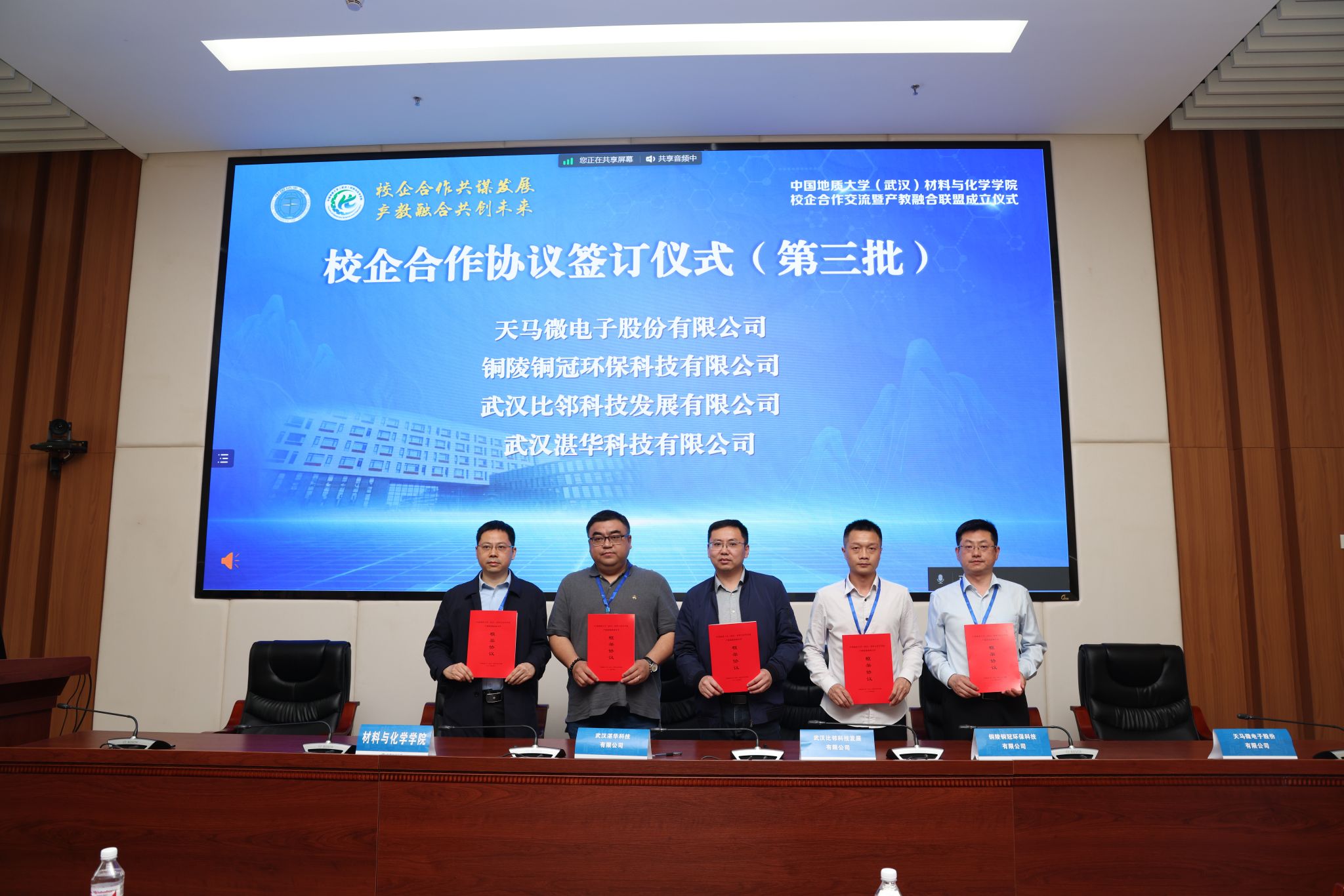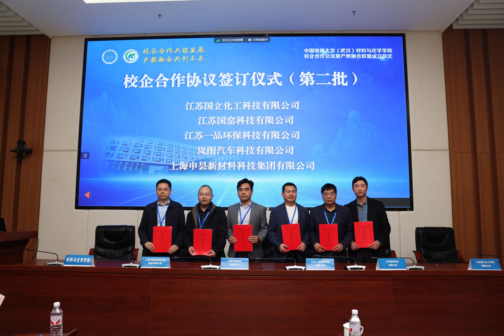 材化公司党委书记梁本哲与10家企业代表签署党建联建共创协议。胡兆初与19家企业代表签署校企合作协议,并为23家企业授员工实践教育基地铜牌。